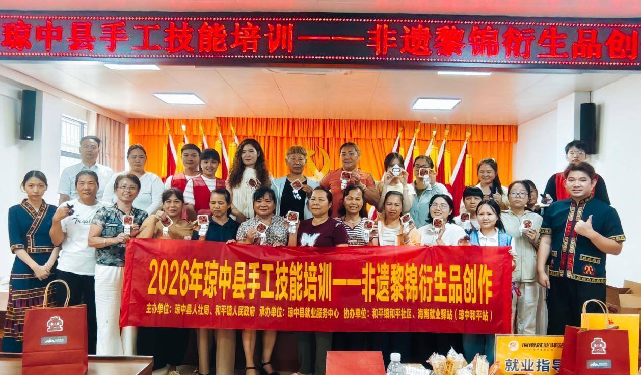 人民网琼中4月9日电 (记者李学山)“原来黎锦不只是老辈人穿的筒裙,还能做成这么可爱的兔子香囊!”4月8日,琼中黎族苗族自治县和平镇和平社区的党群服务中心里,27名学员正围着黎锦传承人王忠文,小心翼翼地给刚做好的黎锦冰箱贴缝上流苏。这场由海南就业驿站(琼中和平站)举办的“非遗黎锦衍生品创作”培训,让平日里忙于家务的全职妈妈等社区居民第一次触摸到了“指尖经济”的温度。