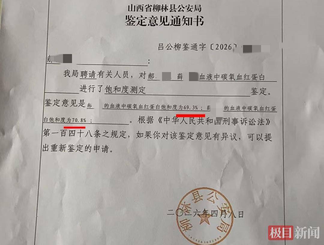 近日,3人的家属从柳林县公安等部门了解到,经初步调查,导致3人煤气中毒,与操作不当有关。柳林县公安局聘请有关人员对3人血液中的碳氧血红蛋白进行了饱和度测定。据该局出具的鉴定意见通知书,郝某夫妇血液中的碳氧血红蛋白饱和度为69.3%和70.8%,另一人血液中的碳氧血红蛋白饱和度为46.5%。郝先生说:“这就意味着,3人的死亡与一氧化碳中毒有关。”